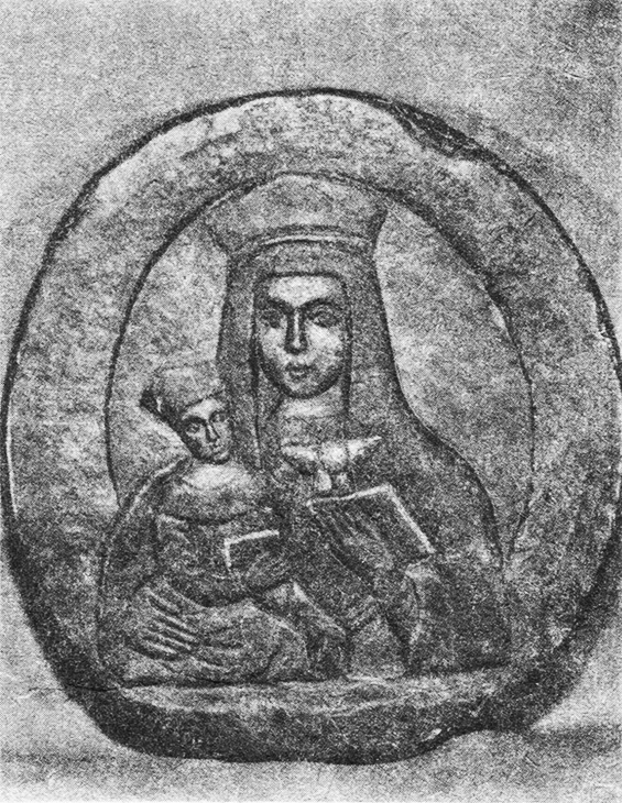 Obraz jest wypukłą płaskorzeźbą w kamieniu drobnoziarnistym o czerwonawym odcieniu, przypominający swym kształtem bochenek chleba. Znawcy uważają, że jest to dzieło sztuki ludowej z terenu Podlasia i pochodzi prawdopodobnie z w. XVII. Przedstawia ono Maryję obejmującą prawym ramieniem Dzieciątko. Matka Boża trzyma w lewej dłoni otwartą książkę, na której stoi gołębica z rozpostartymi skrzydłami. Teologiczna treść obrazu wyraża prawdę, [346]że Najświętsza Maryja Panna jest Rodzicielką Syna Bożego, przez którego Ojciec Niebieski objawił się światu i odkupił ludzkość. Wyjątkową rolę Maryi można poznać dzięki objawieniu w świetle łaski Ducha Świętego.