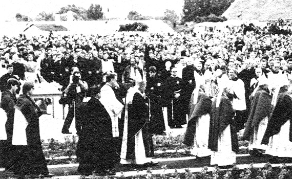 Papież rozpoczyna Najświętszą Ofiarę. Wśród kancelebransów są: abp Bronisław Dąbrowski-sekretarz Episkopatu Polski, bp Ignacy Jeż - ordynariusz koszalińsko-kołobrzeski, bp Jan Zaręba-ordynariusz włocławski, bp Józef Rozwadowski - ordynariusz łódzki, bp Marian Przykucki - ordynariusz chełmiński, bp Jan Wosiński-sufragan płocki, przewodniczący Komisji Episkopatu ds. Misji, oraz wyżsi przełożeni zakonni: o. Klemens Śliwiński - wikariusz franciszkańskiej prowincji Niepokalanego Poczęcia NMP, o. Walenty Potworowski przewodniczący konsulty wyższych przełożonych zakonnych, prowincjał dominikanów, o. Franciszek Rydzak - prowincjał bernardynów, o. Maksymilian Macioszek - prowincjał kapucynów, i o. Janusz Głazowski - przełożony Niepokalanowa.