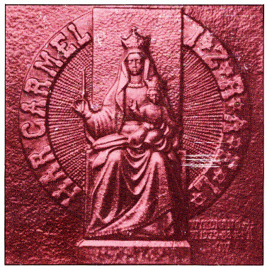 Uczestnik wypraw krzyżowych Bertold z Kalabrii osiedlił się wraz z towarzyszami na Górze Karmel, dając tym początek pustelniczemu zakonowi karmelitów. Jego regułę zatwierdził papież Honoriusz I w 1226 roku. Od początku istnienia karmelici oddawali szczególną cześć Najświętszej Maryi Pannie. Najstarsze zapiski wspominają, że generał tego zakonu, św. Szymon Stock († 1265), otrzymał od Matki Bożej szkaplerz, tj. miniaturową szatę uszytą z dwóch kawałków sukna, na których były wyhaftowane symbole maryjne, oraz obietnicę, że kto mając przy sobie taki szkaplerz łaski pobożnie umrze, nie będzie cierpiał ognia wiecznego. Wydarzenia tego nie poddawano w wątpliwość, a papież Benedykt XIV wydał opinię, że osobiście to objawienie uważa za prawdziwe i że wszyscy mogą je za takie przyjąć. Kult Matki Bożej na Górze Karmel przetrwał do dziś, mimo bolesnych losów zakonu karmelitów. Obecne sanktuarium, nazwane Gwiazdą Morza, wznosi się na ruinach dawnego klasztoru greckiego i zostało zbudowane w XVII wieku. Jest to duży, czworoboczny klasztor w stylu barokowym, a w jego centrum wznosi się kościół na planie greckiego krzyża, zwieńczony piękną kopułą. W głównym ołtarzu znajduje się rzeźba Matki Bożej dłuta Riedy z 1933 roku, która przedstawia Królową na tronie, z Dzieciątkiem na kolanach. Maryja prawą ręką podaje szkaplerz - znak zbawienia, szczególnej opieki i trwałego pokoju. Pielgrzymi i turyści ciągną na Górę Karmel, by oddać hołd Gwieździe Morza, a jednocześnie podziwiać ze stoku góry piękną panoramę miasta Hajfa i zatoki morskiej. Główne uroczystości maryjne w sanktuarium odbywają się 16 lipca. Na fotografii relief z drzwi niepokalanowskiej bazyliki, według projektu i w wykonaniu br. M. Kowalewskiego.