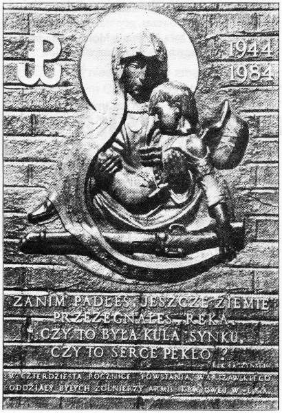 Pieta - główny kompozycyjny akcent całej płyty - przedstawia Matkę Boską Częstochowską w szacie z symbolami Polski Walczącej, trzymającą w ramionach trafione kulą, konające dziecko Powstania Warszawskiego: młodziutkiego chłopca, harcerza - największą ofiarę, jaką naród polski nadaremnie płacił za wywalczenie upragnionej wolności. Ten młodziutki żołnierz Powstania Warszawskiego, wtulony w ramiona Madonny i ogarnięty jej aureolą, z pasem nabojów przewieszonym przez piersi, z daleko odrzuconym hełmem niemieckim, przepasanym biało-czerwoną opaską z literami "AK", z bezwładną ręką, wspartą na karabinie - ma w sobie coś z Odkupiciela, który świadomie poświęcił się i oddał swoje życie za ideę wolności, sprawiedliwości i pokoju. I tak jak Chrystus Pan zmartwychwstał, tak samo idee, za które oddał życie młodziutki powstaniec, zmartwychwstaną w następnych pokoleniach narodu polskiego. Wspaniałą oprawą i dopełnieniem duchowym Piety jest wprowadzenie przez artystę poezji Krzysztofa Kamila Baczyńskiego, młodego poety-żołnierza, który zginął w pierwszych dniach powstania w akcji, z bronią w ręku, i pozostawił za sobą olbrzymi dorobek poetycki. Urywek z jego wiersza, który na zawsze zastygł w metalu, jest nierozerwalnie złączony z całą kompozycją płyty. Artysta, łącząc go z Pietą, nadał mu nowe znaczenie. Słowa przypisane Matce Boskiej Częstochowskiej, skierowane do Dziecka, do Syna, do Ojczyzny, do Narodu - nabierają nowego, wielkiego znaczenia. Matka, stawiająca pytanie: "Czy to serce pękło?" - uzmysławia tragedię walczącej, osamotnionej Warszawy. (...).