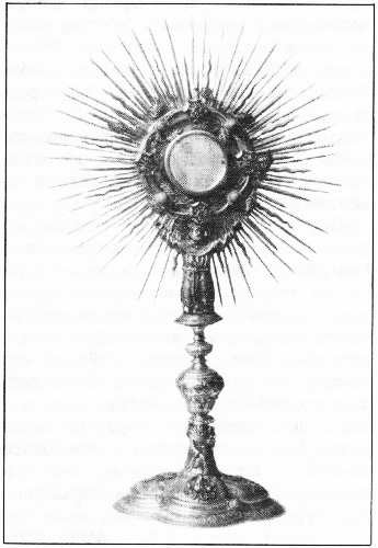 Początkowo Chrystusa Eucharystycznego noszono w kielichu lub w specjalnym otwartym naczyniu, z wmontowaną w jedną ze ścianek kryształową szybką. Stopniowo w następnych wiekach monstrancja przybierała bardziej nam znane kształty. Była więc monstrancja "wieżowa" (w kształcie wieżyczki), którą jeszcze w wielu kościołach można oglądać, a która była poprzedniczką dzisiejszego tabernakulum, czy monstrancja "retabulowa", bardzo skomplikowanej budowy, przypominająca przekrój starego gotyckiego kościoła. Te typy monstrancji były używane aż do XVII wieku, kiedy to rozpowszechniła się, znana do dziś, monstrancja "słoneczna", mająca ukazać nam Chrystusa jako "Wschodzące Słońce", "światło na oświecenie pogan" (Łk 1,78; 2,32), "słońce sprawiedliwości" (Ml 3,20). Pewien wpływ na powstanie tej monstrancji miały również widzenia (na przykład widzenie św. Brygidy - "Dzieciątka jako słońce"). Oczywiście nie tylko ten jeden temat wykorzystywano w monstrancjach. Z wielu typów można wymienić na przykład: nawiązujące do ustanowienia sakramentu Eucharystii, wyobrażające Chrystusa-Człowieka, Chrystusa-Zbawiciela, [165]Chrystusa jako Drugą Osobę Trójcy Świętej, albo przedstawiające figury świętych, szczególnie związane z kultem Eucharystii, lub też figury świętych patronów kościoła, miasta, państwa czy zakonodawców; były także monstrancje pamiątkowe.